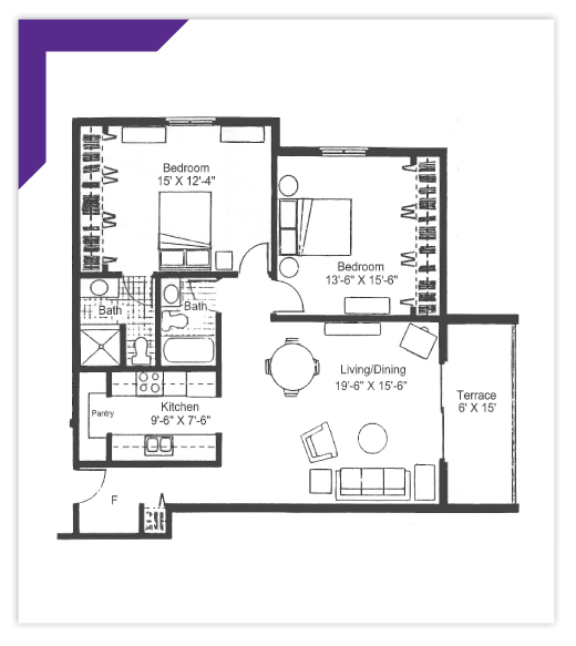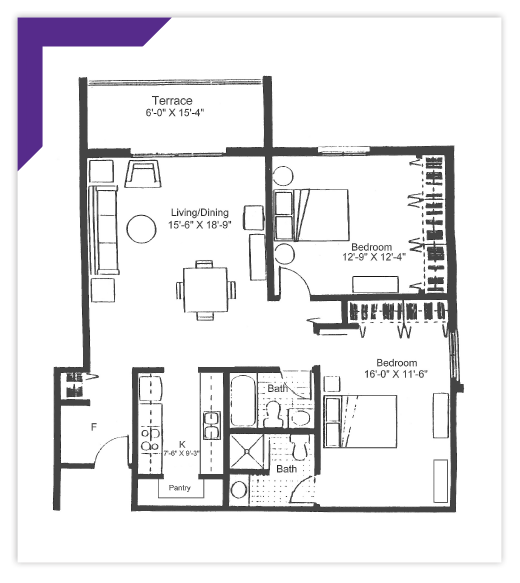 This spacious corner apartment offers a master bedroom, an en suite bath, and a wall-length closet. In addition to the master, there is a second bedroom with wall-length closets, a second bathroom, a full kitchen, and a pantry, all adjoining a living/dining room and an outdoor terrace.