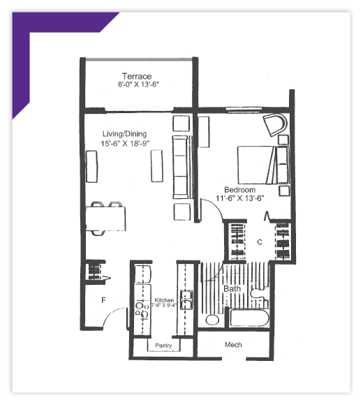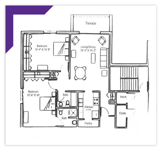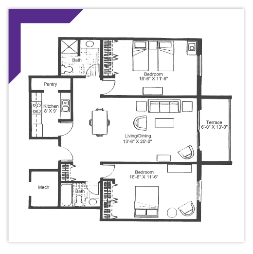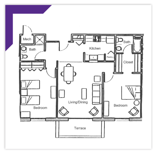 This expansive two-bedroom design is known for its master bedroom’s large walk-through closet connecting to the bedroom and the master bath. The apartment features a central living/dining room, a full kitchen, and a pantry, complemented by an adjoining outdoor terrace that provides ample interior and exterior living space.