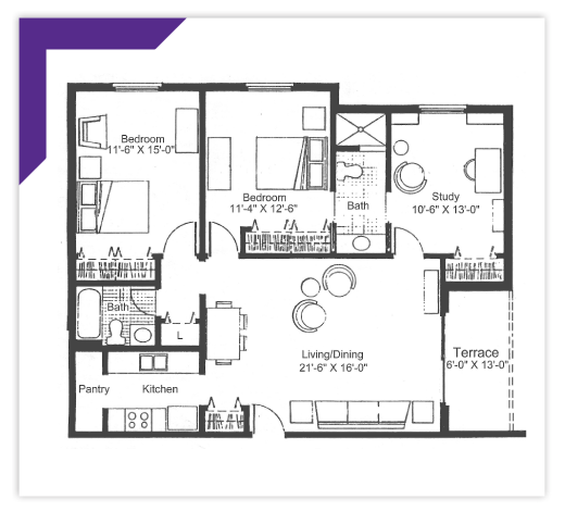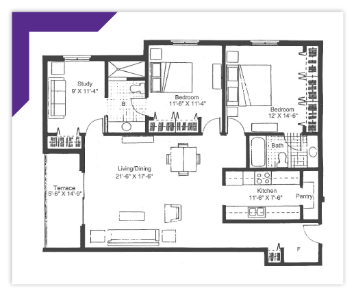 This corner apartment offers our largest square footage, featuring three separate living spaces. The master bedroom with its wall-length closets, full en suite bath, affords you the opportunity to retire in luxury. The additional bedroom is connected to the study by a second full bath. The full kitchen and pantry, which adjoin the open-concept living space, complement every lifestyle.